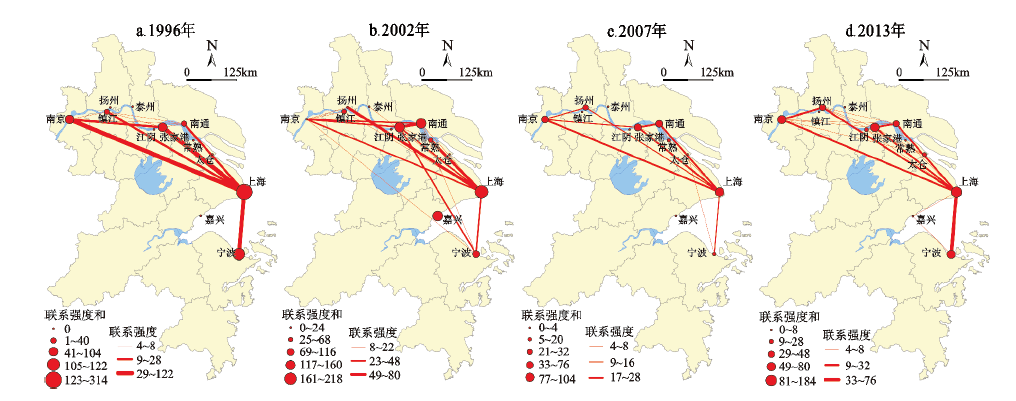 依据1978年改革开放、1985年航运市场初步开放、1996年建设上海国际航运中心战略和航运市场深入开放、2008年金融危机等重要事件将长江三角洲地区集装箱班轮运输划分为准备期(1949~1977年)、萌芽期(1978~1984年)、发展期(1985~1996年)、勃兴期(1996~2008年)、整合期(2008年金融危机以来)等5个阶段。其中1996年党中央提出建设上海国际航运中心的战略部署和航运市场的深入开放标志着长三角集装箱班轮运输步入真正发展期和繁荣期,故文章以1996年作为研究起点,1996~2013年为研究期限,并选取1996、2002、2007、2013年4个时间断面进行重点分析。