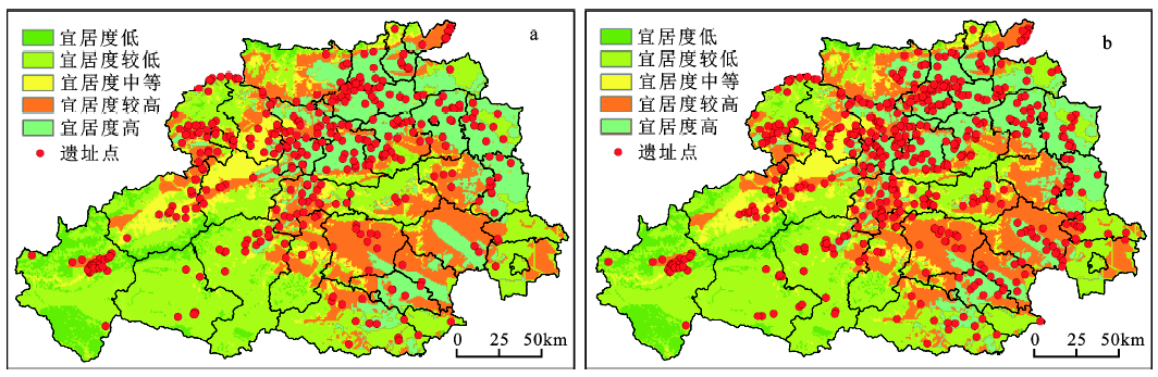 本文还分别以仰韶后期和龙山时期的实际遗址分布数据对该等级评价系统的准确性进行验证。研究结果表明,在仰绍后期,遗址人居环境指数在中等级以上遗址比例达87.1%;在龙山时期,中等级以上的遗址比例达85.5%,说明该模型评价结果较为准确可靠。