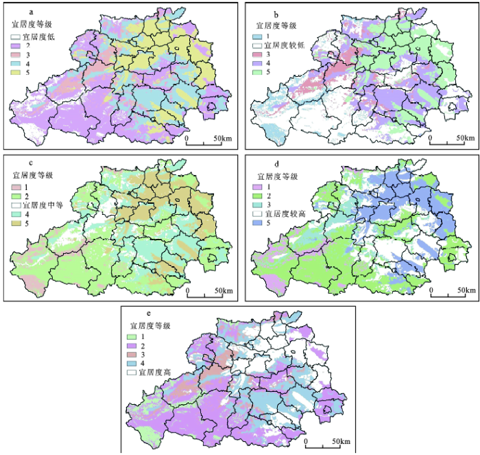 1) 综合等级1为西部山地型遗址,等级2分布地众多,为四周-中心混合型,等级3为西北黄土型,等级4为中部低山-洪冲积平原型,等级5为东部台塬-阶地-平原型。将其与仰韶后期时期实际遗址分布和龙山时期遗址分布图相叠加,统计各等级内的遗址情况,发现绝大多数集中在等级中等及以上,验证该模型可行,同时对遗址发现的准确率较高。该研究的实际意义在于按照位置可以判断该地所处的遗址宜居度等级定量数值、自然环境状况,以及与该地环境相似的其它地理位置与聚落遗址。