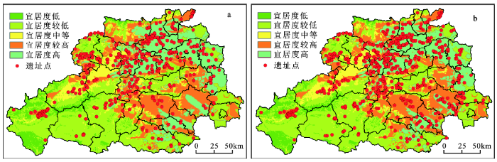 4) 绝大多数宜居度高或较高的遗址分布在郑洛地区北部和中部的伊洛河流域,靠近河流交汇处及沿干流分布。