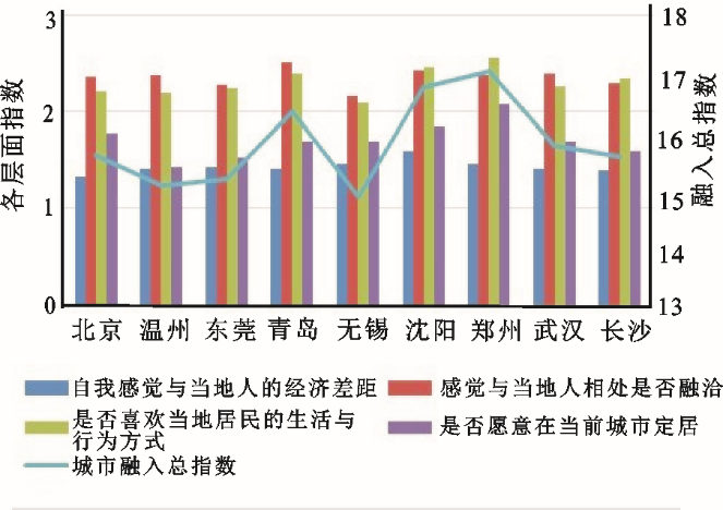 各个城市流动人口城市融入指数见图1,排名由高到低分别是郑州、沈阳、青岛、武汉、北京、长沙、东莞、温州和无锡。首先,北方城市要高于南方城市。排在前三位的郑州、沈阳和青岛全部为北方城市,排在后三位的东莞、温州和无锡同为南方城市。其次,中部城市要高于东部城市。同为北方城市,中部地区的郑州要高于青岛等其他3个东部城市。最后,城市融入呈地域性特征,同一地理区域范围内的城市流动人口融入程度接近。同为环渤海的青岛和沈阳排序接近,同为长江中游的武汉和长沙接近,同为长江三角洲的无锡和温州接近。比较特殊的城市是北京,虽然与郑州、沈阳和青岛同处于北方,且与后两个城市同处于环渤海地区,但其流动人口城市融入程度较3个城市差距较大。