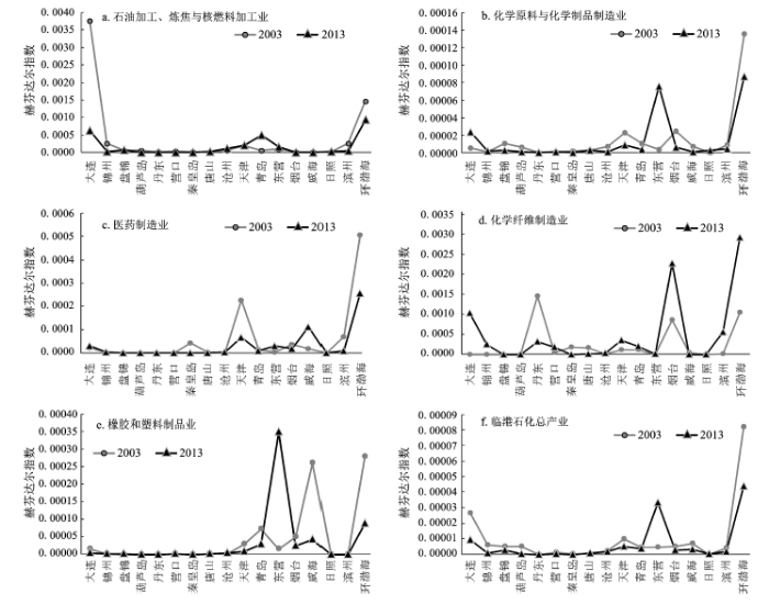 4) 在环渤海地区,一些沿海城市的临港石化产业中突显出某些优势子产业,其集聚程度、产业间协同集聚程度和赫芬达尔指数值均较大或得到显著提高,表明这些产业中不仅集聚着数量较多的企业,具备较大的规模经济,且与其他子产业在投入产出中具有密切联系。例如2003年,大连的石油加工、炼焦与核燃料加工业,盘锦的化学原料与化学制品制造业,丹东和烟台的化学纤维制造业以及威海和青岛的橡胶和塑料制品业;2013年青岛的石油加工、炼焦与核燃料加工业,东营的化学原料和化学制品制造业,大连的医药制造业和化学纤维制造业,东营和威海的橡胶和塑料制品业。而对于整个环渤海地区来说,2003和2013年的优势临港石化子产业均为石油加工、炼焦与核燃料加工业。