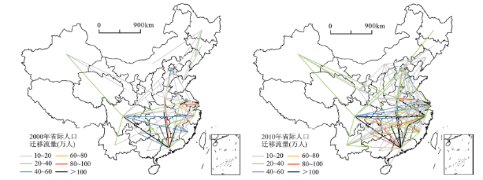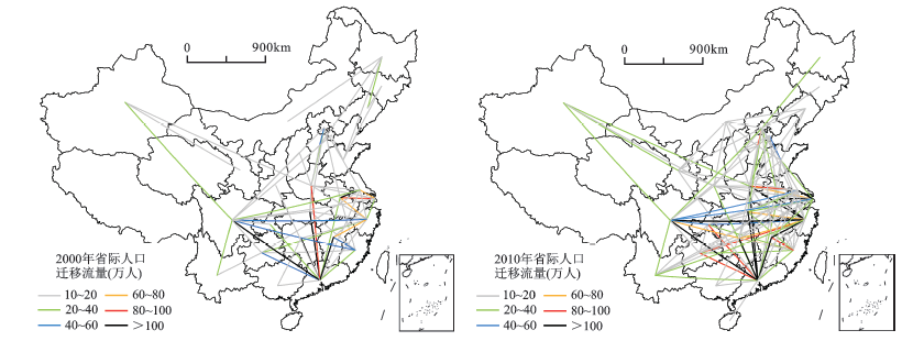 1) 空间流向与流量测算。① 根据人口普查数据统计31省市自治区(不含港澳台)2000、2010年省际迁入、迁出人口数量,构建中国31省市自治区省际人口迁移矩阵。② 依托ArcGIS平台,根据31省的人口迁入、迁出矩阵,创建省际人口流向关联图。为了更好地表征省际人口迁移的主体方向,应用ArcGIS进行自然分级,并剔除人口迁移数量较少(人口迁移量低于10万)的省市自治区。③ 依托ArcGIS平台,以自然分等将省际人口迁入、迁出数量划分为5级,构建人口流量分级关联图,同样剔除人口迁移数量较少(人口迁移量低于10万)的省市自治区。