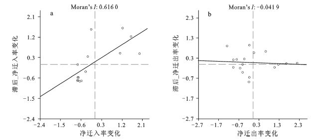 图3 中国省际人口净迁入率变化(a)与净迁出率变化(b)全局自相关