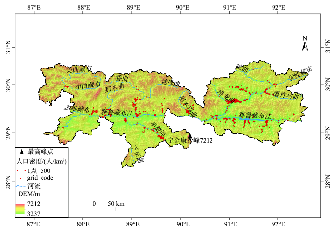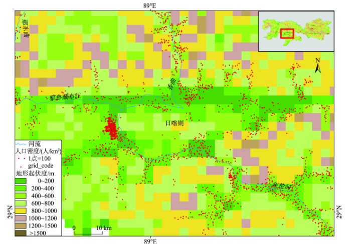 青藏高原被成为世界的“第三极”,地形地貌复杂、高原气候独特,是形成青藏高原自然环境复杂性和生态脆弱性的主要驱动力,复杂的地形地貌及高原气候也是造成青藏高原人口分布不均衡、制约区域经济发展的主要原因。廖顺宝、孙九林等利用GIS工具定量分析了青藏高原人口分布与海拔高度、土地利用、道路网、河流水系等环境因素之间的关系[17]。一江两河地区是西藏的政治、经济、文化中心,是人口较为集中、经济较为发达的区域,地形地貌复杂多变。研究一江两河地区的人口分布特点及其与地形地貌之间的关系对于指导区域可持续发展具有重要的意义。事实上,2011年唐伟、钟祥浩等以县域为基本单元,利用统计年鉴数据以县域为空间对一江两河地区1990-2008年人口分布空间格局的演变进行了分析[18],研究结果表明一江两河地区人口密度和人口总数明显增长,人口分布趋于多核心集中。