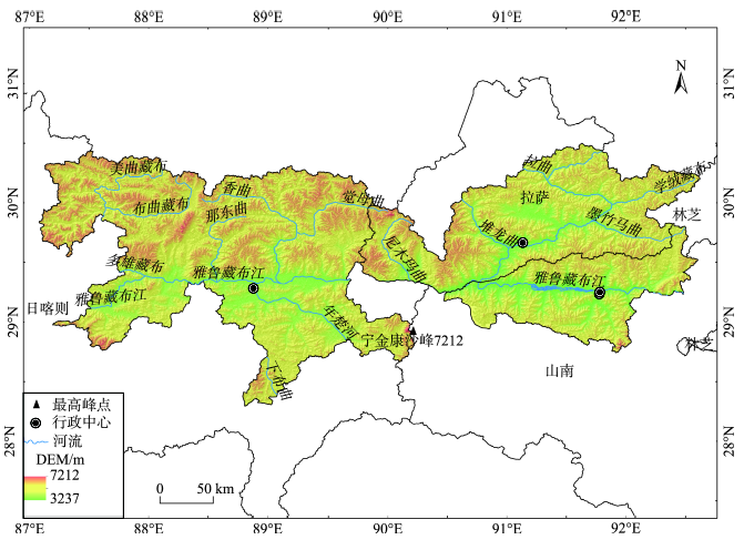 西藏一江两河地区平均海拔在3500~4500 m之间,地势西高东低,南北高中间低,雅鲁藏布江自西向东横贯中部,其干流及支流谷地海拔均在4100 m以下,最低的桑日东南河谷为3237 m,羊卓雍湖西岸的宁金康沙峰海拔7212 m,是本区的最高峰。一江两河北部山脊海拔5000~5500 m,是藏南与藏北气候分野之重要地理界线。一江两河地区多数河流谷地的宽度在2~5 km之间,但在拉萨河、年楚河等支流与干流汇合处,最宽超过10 km。一江两河地区河流两岸地形平缓,多为河漫滩、冲积阶地与洪积扇等,是西藏自治区耕地和人口集中分布区。