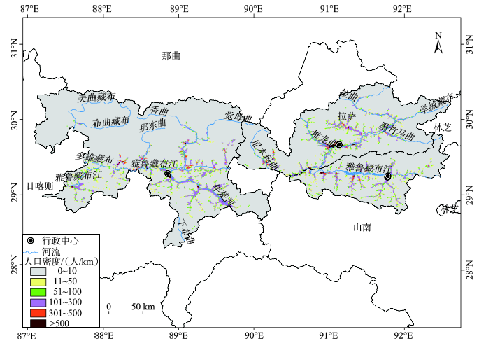 根据图2,人口密度超过500人/ km²的区域主要位于拉萨河谷、年楚河流域以及泽当平原,分别对应拉萨市城关区、日喀则地区驻地日喀则市、 山南地区驻地乃东县泽当镇;人口密度介于 300~500人/km²的区域主要是谢通门县、南木林县、尼木县等零星城镇,拉萨河及其支流部分区域;人口密度介于101~300人/ km²的区域主要位于年楚河流域的日喀则地区驻地、白朗县和江孜县、雅鲁藏布江及拉萨河部分区域;人口密度介于 10~100人/ km²的区域包括一江两河地区的大部分乡镇驻地。