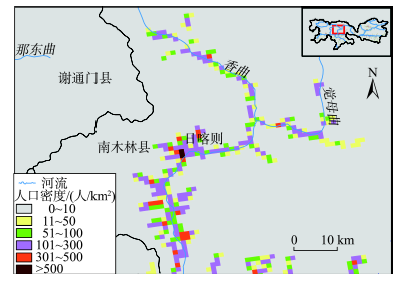 河流对于人口分布的作用主要体现在2方面:① 靠近河流,人类生产生活取用水方便;② 河流两岸地势平坦、交通便利,更适合人类居住以及开展农业生产等活动。西藏高原受特殊的自然条件和相对落后的社会经济条件制约,供水等基础设施薄弱,部分地区的生产生活用水依然依赖于河流。因此,河流是区域制约人口空间分布的主要自然因素之一。由图2可见,一江两河地区人口沿河分布,具有距离河流越近人口密度越高的特点。为了更清晰显示一江两河地区人口分布的这一特点,选取日喀则地区南木林县进行细节放大(图3,红色矩形框为放大区域),可见距离香曲越远,人口密度越小。