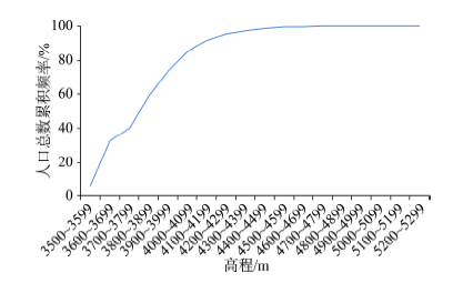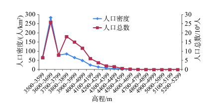 一江两河地区最低海拔为3237 m,最高海拔为7212 m,高差为3975 m。本研究将高程按照100 m划分等级,每一个等级视为一个分析单元。利用ArcGIS 10.1中的区域统计功能,统计出不同高程上的人口密度与人口总量情况,将人口分布与高程之间的关系定量化。由图7可见,在西藏一江两河地区,近99%的人口分布在海拔4500 m以下;大约85.3%的人口分布在3500~4100 m之间,其中3600~3700 m之间分布的人口数最多,占总人口的26%;18%的人口分布在3800~3900 m之间。