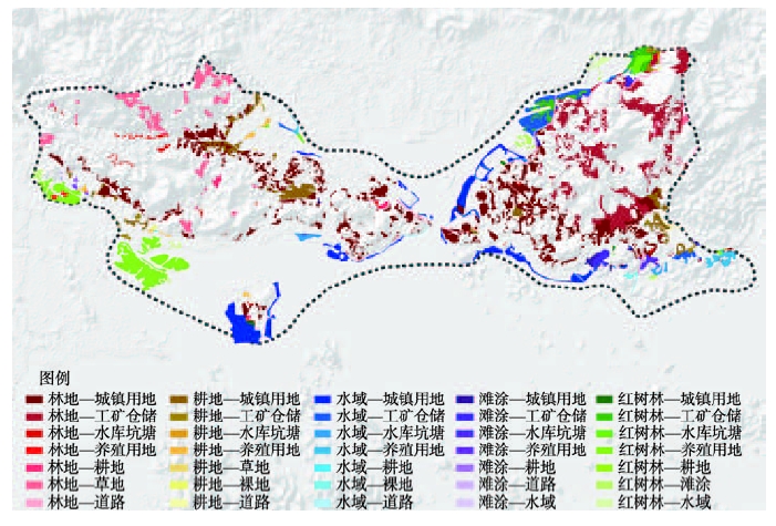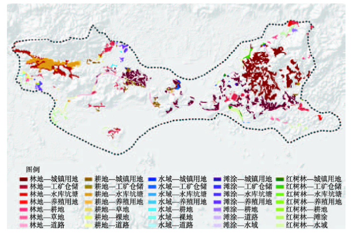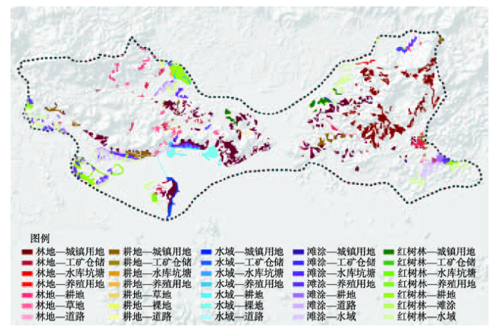 | 耕地 | 林地 | 草地 | 红树 | 滩涂 | 道路 | 城镇 | 工矿 | 水库 | 裸地 | |