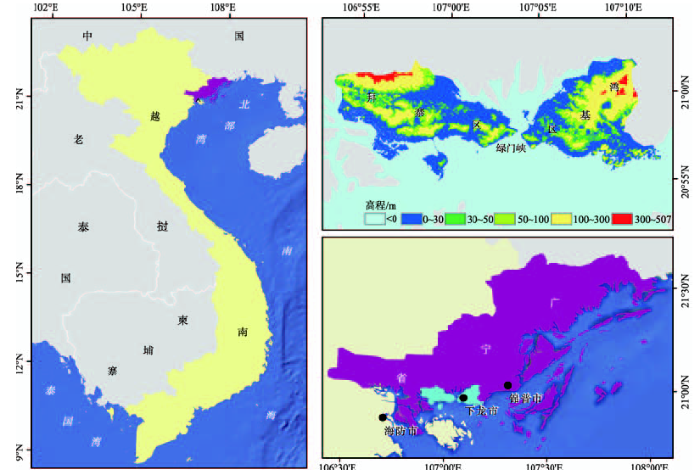 下龙市地处北部湾西岸,位置接近红河三角洲东北角,地理坐标东经106˚50′~107˚30′、北纬20˚55′~21˚05′(图1)。位于红河断裂带以西,属于印支半岛构造体系。该区域多山地,少平原,地势东北高西南低,山地占该市总面积的70%以上,平均海拔150~250 m,最高峰达504 m,山间谷地以东西向为主,平均坡度15‰~20 ‰;下龙市属于丘陵台地港湾式海岸,海岸岩性为泥盆系片岩、砂岩和灰岩,二叠系灰岩和中生代砂岩、黏土岩和泥灰岩[13]。该区属湿润热带季风气候,夏季湿热多雨,冬季干燥寒冷,年平均温度约16.7~28.6 ℃,干、雨两季分明,11月至翌年4月为干季,5-10月为雨季,年均雨量达2000~2200 mm,雨季降雨量占全年总量的80%~85%,年平均空气湿度为84%。冬季为东北季风,夏为西南季风,东北季风较弱,平均风速为2.8 m/s,西南季风较强,最高风速可达45 m/s。