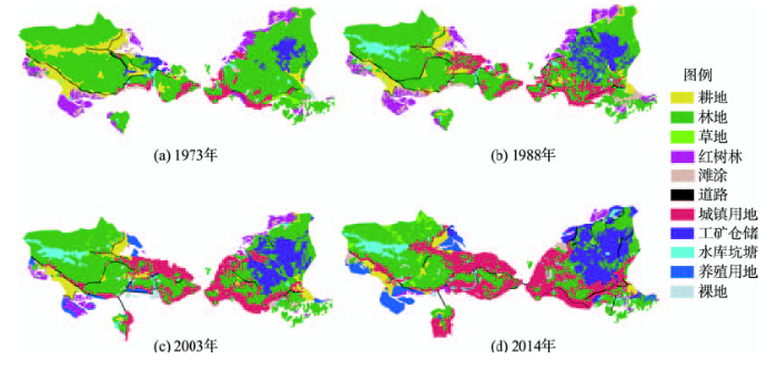 (3)革新开放至施行社会主义市场经济时期,在经济建设的刺激下城市化明显加快,城镇用地和工矿仓储扩建程度为过去15年的3倍和2倍,林地持续下降,面积占比减至52.2%,养殖用地作为新型用地类型开始在拜寨区沿岸出现,导致红树林锐减。土地利用空间格局总体呈现破碎化,东、西两岸城区建设逐渐趋于平衡。