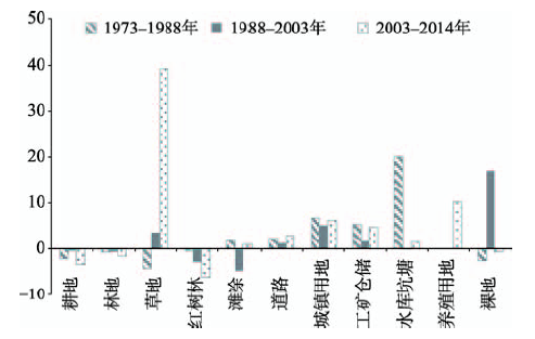 依据式(1)对不同土地利用类型各时期变化速度进行分析,可知(图3):① 耕地、林地、草地、道路、城镇用地、工矿仓储及水库坑塘变化速度均为1988-2003年最缓慢,其中耕地、林地、草地及道路变化速度上呈现1973-1988年小于2003-2014年的趋势,城镇用地、工矿仓储及水库坑塘变化速度上呈现1973-1988年大于2003-2014年的趋势;② 滩涂和裸地变化速度为1988-2003年最快,1973-1988年次之,2003-2014年变化速度最慢;③ 红树林面积减少速度呈逐期加快的趋势;④ 养殖用地在2003-2014年变化速度最快,由于其面积在1973年和1988年为0,故1973-1988年和1988-2003年2期体现不出变化速度的情况。