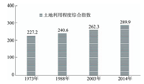 依据式(2)对下龙市各时期土地利用程度变化进行分析(图4)可知:① 该区域土地利用程度整体偏低,与青岛市2000年土地利用程度综合指数288.5[18]进行对比,下龙市2014年土地利用程度与青岛市2000年近似;② 各时期土地利用程度变化巨烈,1973-1988年、1988-2003年和2003-2014年土地利用程度综合指数变化差值分别为13.4、21.7和27.6,与青岛市1990-2011年综合指数变化差值10.9[18]进行对比,下龙市3个时期的变化均高于青岛市,说明该区域各时期土地利用变化差异较大。