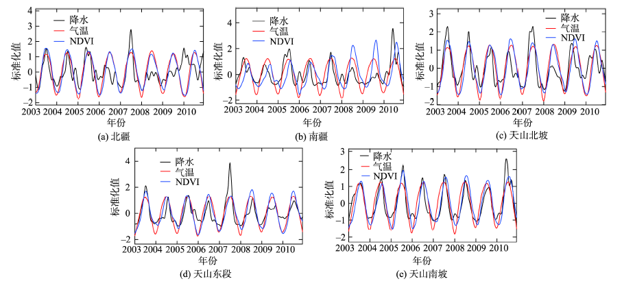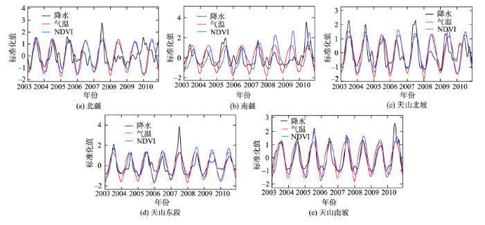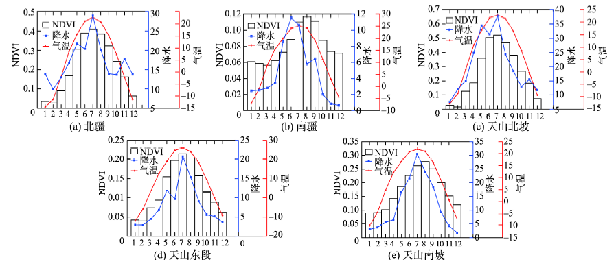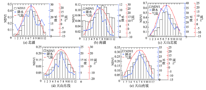 不论哪个分区,新疆降水量及均温变化趋势基本一致,雨热同期现象明显,年际间最大值及最小值不断交替出现,呈明显波动特征,而年内同样呈倒钟形分布,降水、气温最大值均集中出现在生长季节期间,尤其是5-8月(图6)。北疆地区气温及植被覆盖指数变化趋势较为一致,而降水所呈现的变化更为复杂,植被长势与气温变化之间的相关性更为强烈(图6(a));南疆NDVI相对气温变化存在一定的滞后效应,大部分年份其最大值和最小值出现的时间滞后于均温最大值、最小值出现的时间,对降水同样存在滞后效应,但降水量本身变化较均温更复杂(图6(b));天山北坡NDVI对降水表现出较为明显的滞后效应,且NDVI与气温变化趋势表现的更为一致(图6(c)),天山北坡植被生长的主要气候限制因子为降水;天山东段地区NDVI与降水、气温之间变化趋势较为一致,滞后效应并不明显(图6(d));而天山南坡与南疆地区类似,NDVI对降水、气温均表现出较为明显的滞后效应,而对气温的滞后效应最为明显(图6(e)),南疆/天山南坡地区的植被生长,既受到降水的抑制,又会受到气温的影响,但气温作为主要因子,对天山南坡植被生长的限制作用表现的更为突出。
