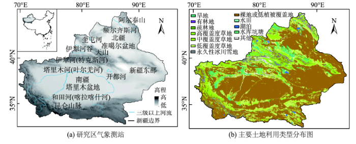 图1 研究区气象测站及新疆主要土地利用类型分布