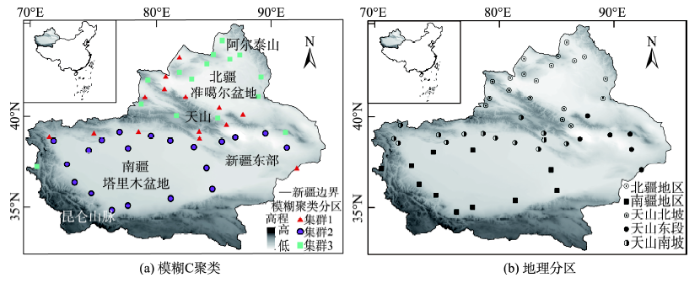 考虑气温因子,结合海拔、经纬度、月均温、月最高温、月最低温、各月气温日较差、生长季节期间(5-8月)均温[33]及最高温信息,采用模糊C聚类法将新疆50个测站隶属于3个集群(图2(a))。同时,为了保证分区结果的可靠性与合理性,结合新疆复杂的地域背景,并参考相关文献中天山山区气象测站的地理位置分布[34-35],将本文所选用的50个气象测站隶属于5个类区(北疆、南疆、天山北坡、天山东坡及天山南坡)(图2(b))。