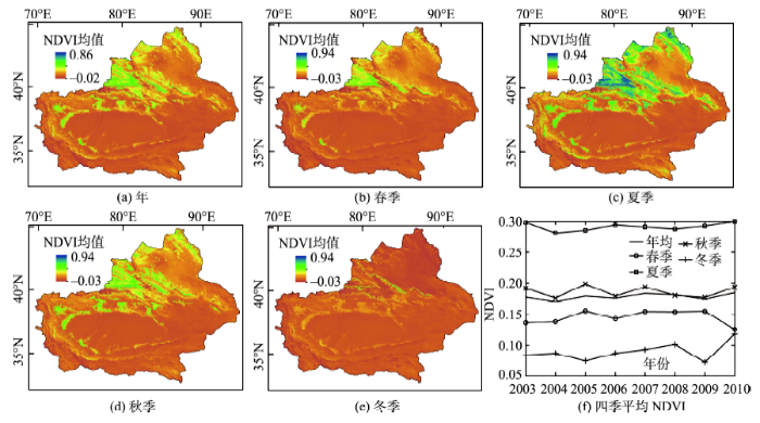 2003-2010年间年均NDVI变化不大(图3(f)),均位于0.17-0.18之间,全疆夏季NDVI显著高于其他季节,位于0.28-0.29之间,秋季次之,位于0.17-0.19之间,春季NDVI位于0.13-0.15之间,而冬季NDVI最低,位于0.07-0.11之间。四个季节NDVI年际差异较小,冬季NDVI年际差异最大,而夏季NDVI年际差异最小,尤其是2009-2010年间春、冬季NDVI出现大幅变化,这很有可能与全疆范围2009年大旱有关。