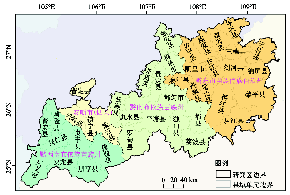 4) 气象数据。年均降水量与气温空间分布数据系通过对贵州南部地区及其周边共计84个国家气象站点提供的降水与气温观测数据,采用ANUSPLIN插值方法插值而成。