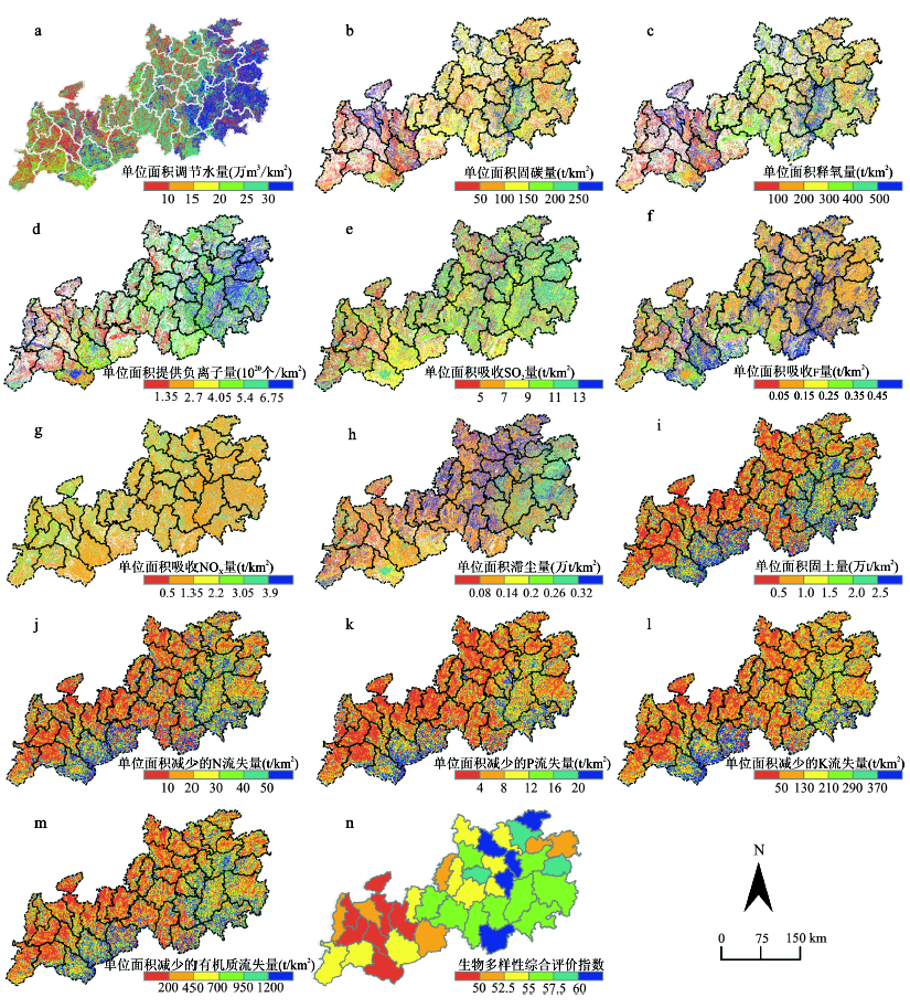 Table 2 The physical quantity of ecosystem services at each of county units in the southern Guizhou in 2010