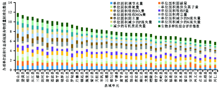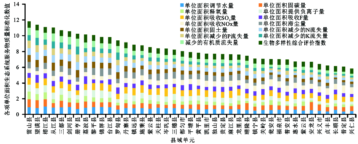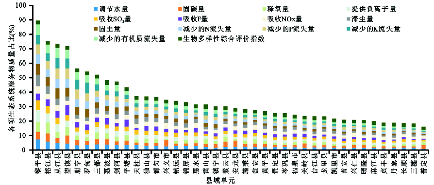 以各县的各项生态系统服务物质量占全区的百分比作为纵坐标,并对同一县域进行累加,得到图3。可见黎平县的综合生态系统服务物质量在贵州南部所有县域单元中最多,其次是榕江县、从江县和望谟县;最少的是普定县,其次是三穗县、长顺县、丹寨县和贞丰县。
