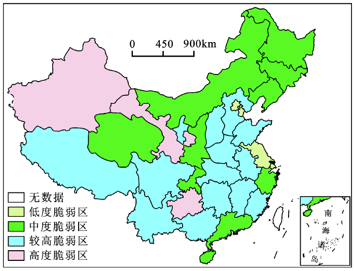 对全国人口健康脆弱性水平进行等级划分,进一步揭示脆弱性分布的地域差异特征。这里以脆弱性指数的平均值(AVG=0.510 4)和标准差(STD=0.085 7)作为评价依据,将全国各省区划分为低度、中度、较高和高度4个脆弱性等级。其中,脆弱性指数介于(0,AVG-STD,即0~0.424 7)之间的省区界定为低度脆弱区,介于(AVG-STD,AVG,即0.424 7~0.510 4)之间的地区为中度脆弱区,介于(AVG,AVG+STD,即0.510 4~0.596 0)、(AVG+STD,1,即0.596 0~1)之间的地区分别命名为较高脆弱区和高度脆弱区(图2)。