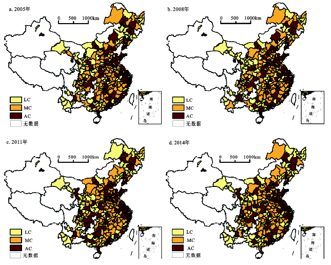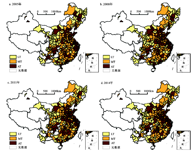 为反映城市化类型的时空分异,将中国285个地级市2005、2008、2012、2014年城、市化水平值进行算术平均,根据城、市发展同步均衡性初步划分为两种类型:非同步均衡型,包括城先于市型(AC-MT、AC-LT、MC-LT)及市先于城型(MC-AT、LC-AT、LC-MT);城市同步均衡型,包括高水平同步(AC-AT)、中水平同步(MC-MT)、低水平同步(LC-LT)型。属于城市同步型地级市数量211个,达到74%,其中,属于高水平同步型75个,属于中水平同步型59个,属于低水平同步型77个。属于城先于市型和市先于城型的地级市均为37个,分别占总数的13%。说明中国大多数城市属于同步发展型。