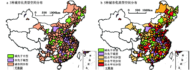 1) 在城市化类型空间变化上,从城视角来说,中国城化水平空间分布在研究期内均呈离散状态,高城化水平的城市大多为省会城市或直辖市;从市视角来说,市化水平的空间分布呈显著的“核心-外围”结构,高市化水平城市向东部沿海地区聚集。从城、市共同作用的视角来说,中国大多数城市属于同步发展型。城先于市型在中国空间分布较离散,市先于城型主要分布于中部地区。
