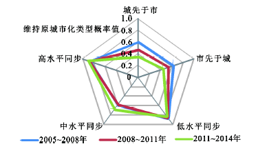 由图4可知,并非每种城市化类型的稳定性均下降,稳定性降低的城市类型为城先于市与市先于城型,高、低水平同步型保持较高的稳定性,中水平同步型的稳定性有所提高。说明同步型城市较非同步型具有更好的稳定性,尤其是低水平与高水平同步型,保持原类型的概率均在0.8以上。其中,高水平同步型的稳定性由2005~2008年的0.872上升为2011~2014年的0.904,说明高水平同步型稳定性最好且具有越来越稳定的趋势。