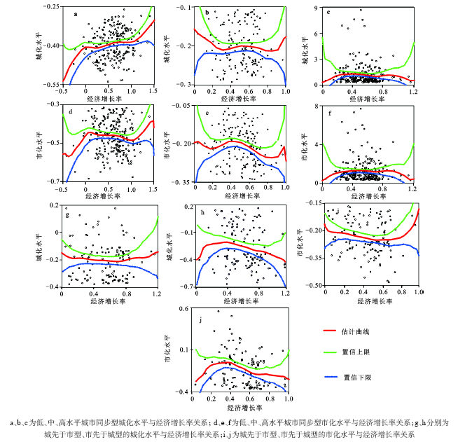 对于高、中、低水平同步发展的城市化类型,其经济增长与城市化水平关系也存在明显差异。低水平同步型城市经济增长率与城化、市化水平呈三次函数关系,即经济增长可以显著提高城化、市化水平,由于该类型城市城化、市化水平均较低,城市经济集聚规模较小,而城市经济增长需要大量劳动力及其他投入从乡村部门转向城市部门,在规模经济作用下要素不断向城市集中,可以有效扩大集聚规模,进而提高城、市化水平;中水平同步型城市具有一定集聚规模,经济增长率与城、市化水平关系呈二次函数关系,但与城化水平二次关系特征不显著,说明对中等水平同步发展的城市,经济增长率的提高对城化水平没有表现出明显的推动作用;高水平同步型城市中,由于包含北京、上海等超大型城市,导致出现部分异常值,但仍可以看出城市经济增长与城、市化水平呈显著的二次函数关系,说明过低或过高的经济增长率不利于该类型城市的城化、市化水平提高,且存在一个经济增长论率的最佳区间0.2~1.0,在该区间内城市的城化、市化水平最高。