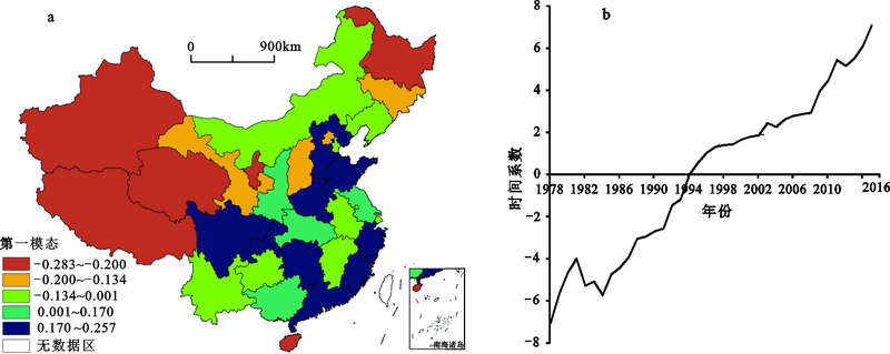 特征向量可观测变量的空间分布状况,如果特征向量的各分量正负一致,反映区域变量变化趋势相同,分量绝对值较大处为中心;如果特征向量的分量呈正、负相间分布,则说明区域变量有两种变化趋势,适合进行分类型分析。时间系数反映区域特征向量分布型式的时间变化特征,时间系数为正,说明该分布类型最为典型;时间系数为负则表明该年呈相反的分布型式,系数绝对值越大,这类分布型式则越典型。