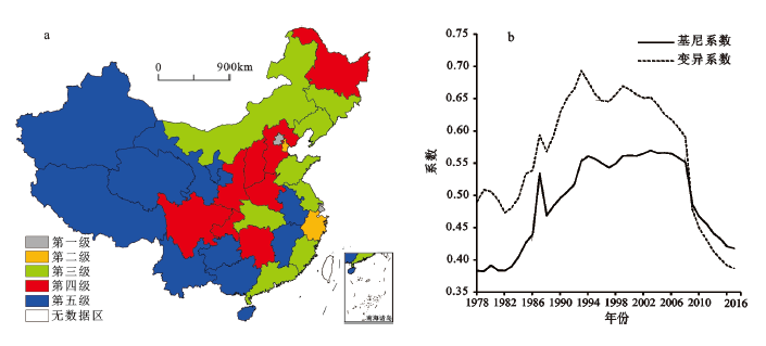 图3   1978~2015年间中国省域消费水平聚类格局(a)及差异变化(b)