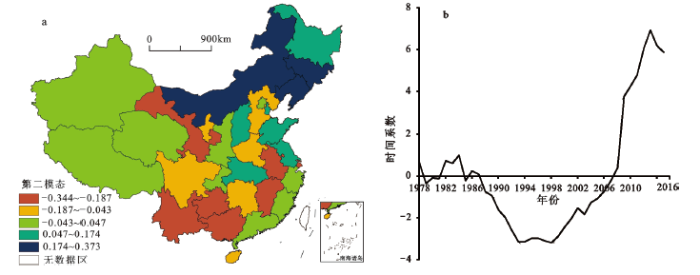 第二特征向量解释了原始数据18.2%的方差贡献率。由图2 看出,特征向量空间分布整体呈现分块集聚特征,并具有显著的南北分异态势。其中,特征向量正值区主要集中于东北三省及华北部分地区,绝对值较高;而特征向量负值区遍布于西部省份及长江以南省份,其绝对值较高,河南及周围省份地区的特征向量绝对值较低。整体上,时间系数呈显著的非线性变化特征,1978、1982~1984、1986~1987及2008~2015年间的时间系数为正值,表明该时段东三省及华北地区的消费水平较高。而1979~1981、1985及1988~2007年间的时间系数为负值,表明以上时段广大南方省份整体消费水平高于北方省份。具体来看,1978~1988年间的时间系数绝对值较低且处于波动变化状态,反映北强南弱的消费空间模式并不典型;随后时间系数由正转负,且绝对值持续增加,说明该阶段消费空间模式由北强南弱转变为南强北弱,并得到一定程度的强化;1998年后时间系数的绝对值开始减少,并在2008年后由负值转正值并快速上升,消费空间再次转变为北强南弱模式;2013~2015年间时间系数绝对值再次出现下降,表明这种模式并不稳定。