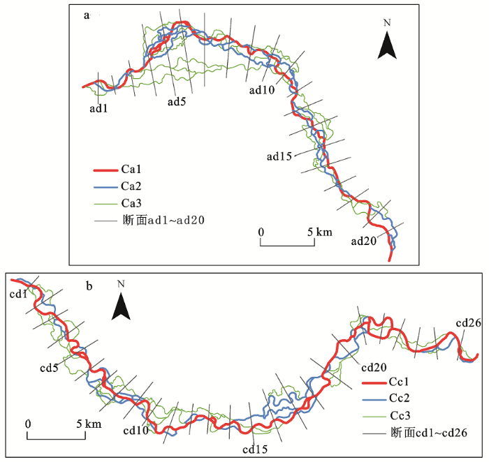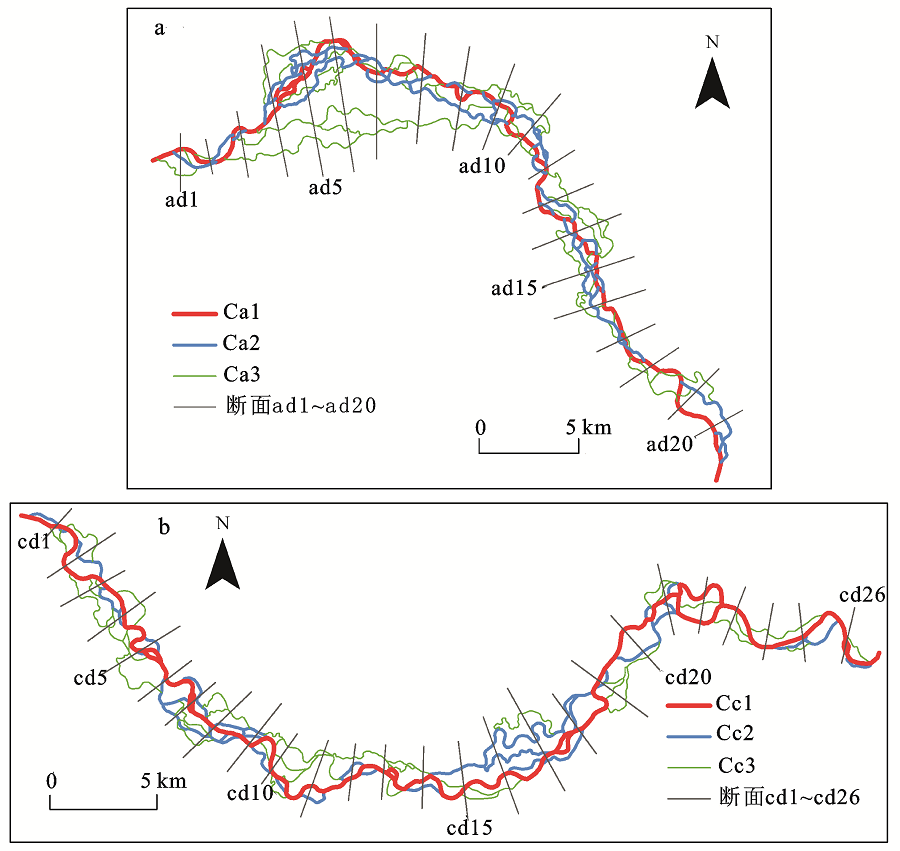 将遥感影像进行5、6、4波段的假彩色合成(这种波段组合可以有效区分陆地和水体,深浅的橙色和绿色是陆地,冰显示为很亮的粉红色,深浅蓝色是水),在ArcGIS10.2中采用线矢量对活动河道进行解译,并使线尽量沿着左右岸线的中间[23]。由于网状河分支河道相互连通的复杂性,加上遥感影像分辨率的限制,有些宽度较小的河道难以识别,为了使图像解译与后面的分析简单化,在固定1:5 000的比例尺下,对于那些平面形态宽度小于3个像元的非活动河道不予勾画,对于那些宽度小于5个像元的心滩和江心洲仍作为河道的一部分。在绘制活动河道时,按照流量从小到大的顺序(176 m3/s、978 m3/s、1 610 m3/s)依次矢量化,即先以4月18日的影像为底图勾画活动河道,所画的活动河道命名为第一类活动河道Ca1和Cc1;再加载8月8日的影像勾画新增加的活动河道,将其命名为第二类活动河道Ca2和Cc2;最后再以7月23日的影像为底图勾画又增加的活动河道,将其命名为第三类活动河道Ca3和Cc3。其中Ca1、Ca2、Ca3是阿万仓乡附近网状河段的活动河道,Cc1、Cc2、Cc3是采日玛乡附近网状河段的活动河道。主河道的确定以Ca1与Cc1为基准,因为这两种河道流路基本都是以单线程为主。当Ca1与Cc2发生分汊时,根据分汊河道的走向与宽度确定主河道。沿垂直网状河道带的方向每隔约2 km设置一个横断面,其中阿万仓乡网状河段共设20个横断面(图2a),采日玛乡网状河段共设26个横断面(图2b)。
