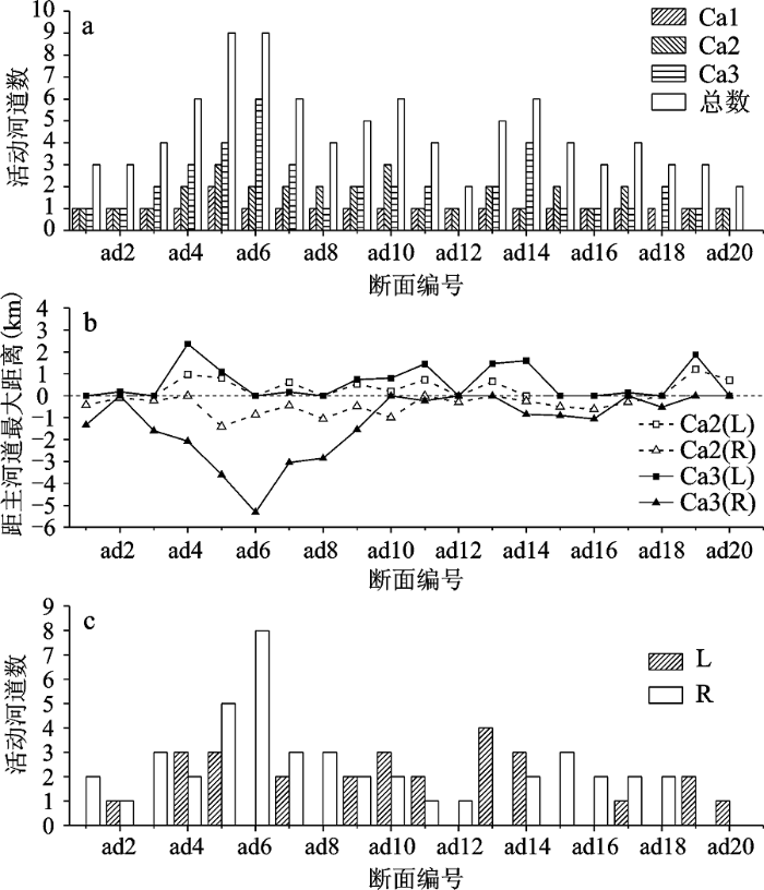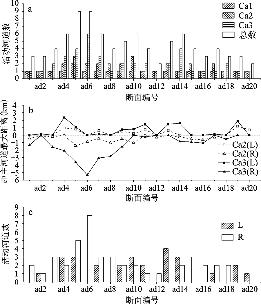 图3 阿万仓网状河段各断面不同类别活动河道数(a),各断面上Ca2和Ca3河道距主河道的最大距离(b)及主河道两侧活动河道数(c) L、R分别表示位于主河道左边和右边。