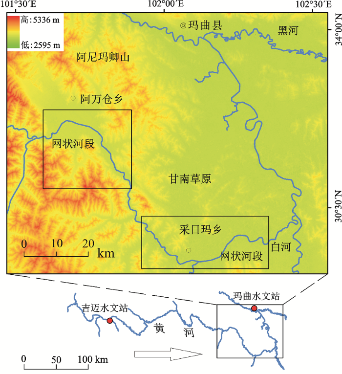 黄河第一湾流出峡谷段后,其入口为甘肃玛曲县阿万仓乡,弯顶中部左岸为玛曲县采日玛乡、右岸为四川若尔盖县唐克乡,出口端为玛曲县城西北侧。黄河第一湾呈现宽阔的河谷平原地貌,主河道左为甘南草原,数条弯曲型支流汇入,右侧是若尔盖草原和沼泽,白河从唐克汇入,黑河从玛曲县城东南汇入。在黄河第一弯270 km的河长上,沿途出现了多种河型,其中阿万仓乡与采日玛乡附近分别发育了网状河型,主河道长度分别为50 km和65 km;2个河段入口端与出口端海拔高度分别为3 514 m和3 475 m,3 464 m和3 430 m;主河道平均比降分别为0.78‰和0.52‰,是青藏高原网状河流研究的理想场所。