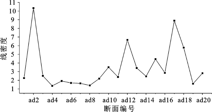 如图4所示,断面ad4~ad9的线密度较小且相差小,在1.35~2.19之间,相差0.84,平均值为1.70。断面ad1~ad3与ad10~ad20的线密度相差较大,在1.60~10.34之间,相差8.74,平均值为4.28。断面ad4~ad9之间是广阔的草甸湿地,网状河的发育较好,断面上活动河道数多,河间地宽,线密度较小;断面ad1~ad3与ad10~ad20之间处于峡谷地带,网状河道分布范围受到限制,断面上活动河道数相对较少,河道之间距离较近,线密度较大。
