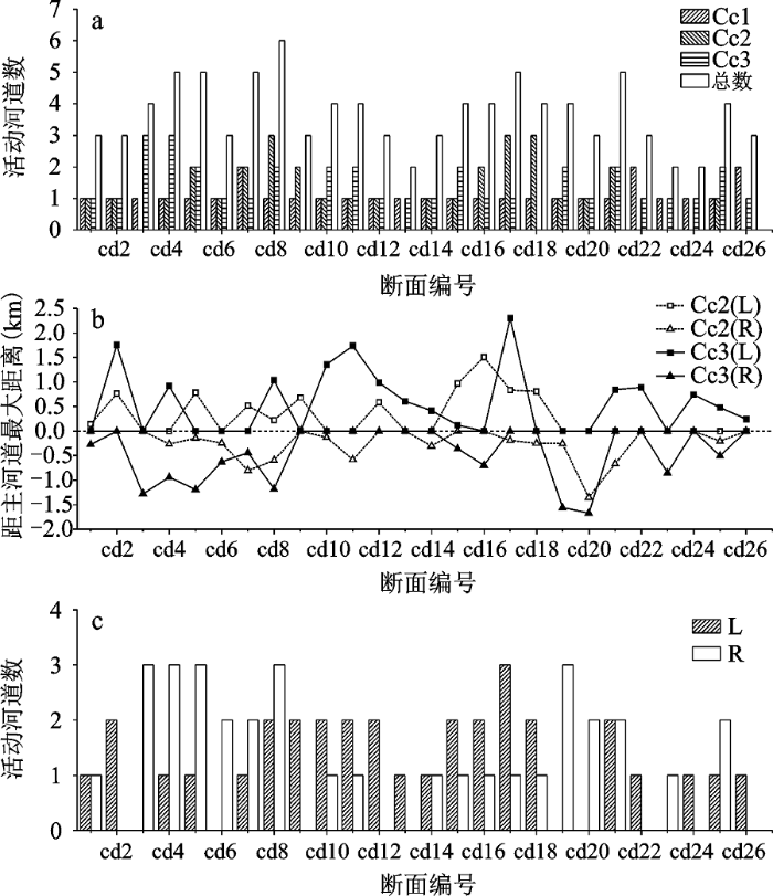 图5 采日玛网状河段各断面上不同类别活动河道数(a)、各断面上Cc2和Cc3河道距主河道的最大距离(b),以及主河道两侧活动河道数(c) L、R分别表示位于主河道左边和右边。