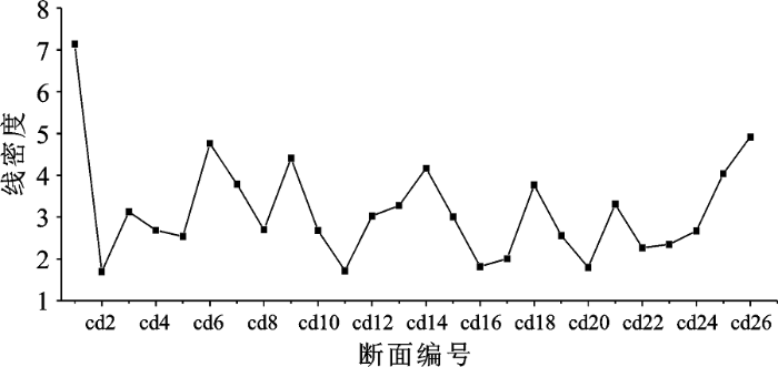 采日玛网状河段各断面上活动河道的线密度见表2。采日玛网状河段26个断面上活动河道的线密度波动变化较大,除了断面cd1的线密度达到了最大值7.14外,其余断面的线密度基本在2~5左右波动(图6)。这里未出现像阿万仓河段那样连续多个断面(ad4~ad9)线密度波动较小的情况,这是因为采日玛网状河段处草原湿地发育相对较窄,使得分支河道发育较短,整个网状河段较为狭长,连续断面的线密度波动较大。断面cd10~cd26的网状河大部分位于甘南草原,平均每个断面的线密度为2.91。结合遥感图像,发现穿越草原湿地且网状河发育较好的断面有cd11、cd16和cd17,但是这3个断面的线密度相对较小,分别为1.72、1.82、2.01,平均值为1.85。