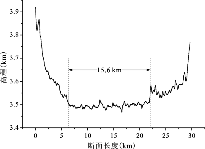 在没有峡谷限制的草原湿地河段,网状河分支河道发育较多且长度也相对较长。这是因为平坦宽阔的地形条件有利于网状河的发育,河间地较宽,相应断面线密度较小。在峡谷限制的河段,由于河谷的宽度受两侧基岩限制较大,短距离内宽窄多变,导致各断面线密度相对较大且变化较大。为了进一步探究网状河的发育情况与其河谷的关系,对断面的线密度与断面对应的河谷宽度进行分析。前面已知阿万仓乡的断面ad5~ad9之间与采日玛乡断面cd16、cd17之间网状河的分支河道发育较好,线密度较小且波动小,因此选取这些断面作为待分析断面。此外,根据图像又选取4个分支河道发育较好且河谷易辨别与测量的断面,ad11、ad14、ad16、cd8,共11个断面。在ArcGIS10.2环境下加载DEM图像,将选取的断面线延长,使其与两侧山地相交,生成剖面图,根据剖面图确定该河谷的宽度。例如图7是断面ad7的剖面图,由图确定的河谷宽度是15.6 km。