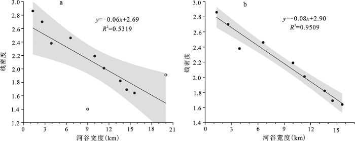 图8 河谷宽度和线密度的回归关系(95%的置信水平) a是11个选定断面的结果,b是剔除断面ad5、ad8(a中空心显示)后的结果
