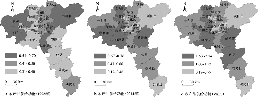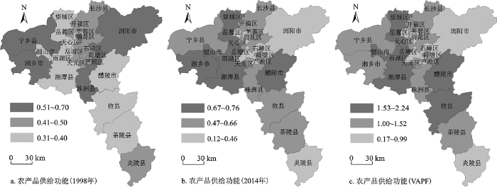 1998~2014年长株潭地区农产品供给功能纵向比较系数(VAPF)介于0.17~2.24之间(图1c)。除雨花区等8个县市的VAPF<1之外,其他的15个县市区VAPF均在1以上,韶山市和湘潭县的VAPF更是在2以上,说明近20 a间,长株潭地区各县市区的农产品供给功能均呈上升趋势,有着较大的农业发展潜力。农产品供给功能强势区主要分布在主城区外围耕地资源丰富、耕地质量较好、现代农业技术成熟的地区。
