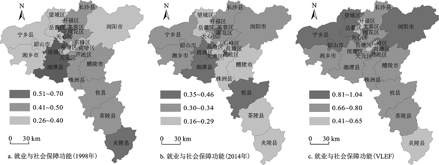 由图2a可知,1998年长株潭地区的农业就业与社会保障功能指数介于0.26~0.70之间,均值为0.45,图2b显示LEF指数介于0.16~0.46,平均值较1998年下降0.15,图2c显示长株潭地区的VLEF值都在1以下,区域就业与社会保障功能整体处于劣势。长株潭地区作为湖南省发展最快的区域,近年来的快速发展导致建设用地大量占用耕地[23],二三产业所能提供的非农就业机会越来越多,不少农村居民选择外出务工。因此虽然随着农业现代化的发展,农民人均纯收入、劳均农业总产值总体呈逐年递增趋势,但是耕地承载劳动力数量和农业总产值占GDP比重不断下降,农业提供的社会生活保障程度较低。