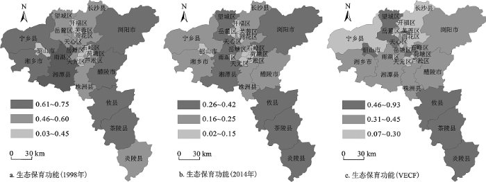 由图3可知,1998年和2014年生态保育功能较强的区域均处于长株潭外围非核心区域。1998年长株潭地区的ECF指数介于0.03~0.75之间,2014年介于0.02~0.42之间, VECF介于0.07~0.93之间,说明长株潭各县区生态保育功能较1998年均呈下降趋势。芙蓉区、雨花区、天心区、岳塘区、开福区、石峰区紧邻长株潭城市群的核心区,农业的生态保育功能一直较弱。其中芙蓉区,雨花区、天心区等区域发展快、建设用地比重大、水田面积有限、水域面积少、森林覆盖率较其他地区也偏低,再加上近年来农业投资中化肥占有量也越来越多,生态保育功能较弱。石峰区、荷塘区、岳塘区是长株潭地区的工业承载体,城镇化水平较高,人口密度大,生态环境恶化严重。生态保育功能一直较好的区域有炎陵县、茶陵县、攸县、浏阳市,这些区域多为山地。