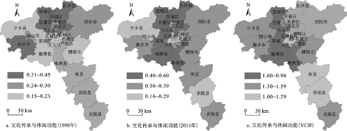 长株潭地区的旅游休闲农业最早发展于长沙市,然后逐渐渗透到株洲市、湘潭市[24]。从图4a来看,1998年长株潭地区农业文化传承与休闲功能主要分布在长沙周边地区,长沙是历史名城,拥有深厚的历史文化,社会经济的发展也促进了市区周边地区文化传承与休闲功能的发展,其它地区经济发展较慢,文化传承与休闲功能也比较薄弱。从图4b可知,2014年23个县市区的CIF指数介于0.16~0.60之间,均值为0.36。功能较强的区域有开福区、长沙县、望城区等,这些区域距离中心城区较为接近,农业休闲旅游的客源来源广,农业休闲旅游项目开发多且收益好。其中,望城区、长沙县是长株潭地区较为典型的传统文化聚集区,一些具有悠久历史文化的古镇如望城区的铜官古镇、靖港古镇,长沙县的榔梨古镇、开慧小镇近年来得到了较好的维护与开发,成为游客观光休闲的圣地,同时也让浓郁的古镇文化成为这些区域具有较强文化传承与休闲农业功能的天然载体。除此以外,这些区域拥有相对较多的农业科技园、星级休闲农庄或者因地制宜发展农业休闲观光业,为游客提供农业观光休闲场所。从图4c可知,各县市的VCIF指数均在1以上,2014年长株潭地区各县市区农业文化传承与休闲功能较1998年有明显提升。