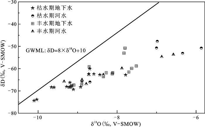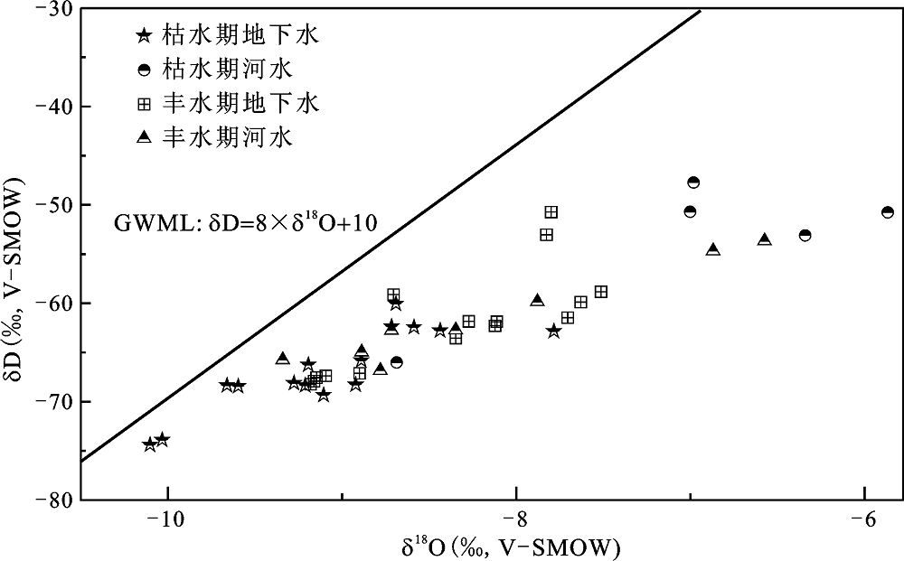 丰水期地下水与地表河水的散点分布较为集中且大都落在全球大气降水线的中部偏下,两者分布位置较为接近(图6),同时这一时期地下水样点也与个别降水样点相近,说明这一时期两种水体间交互作用显著。而枯水期地下水与地表河水的δD和δ18O的散点较为分散,河水样点大都偏离地下水样点,落在全球大气降水线上部的右上方,表明这一时期地表河水δD和δ18O主要受到蒸发富集作用的控制,而地下水的点则集中在中部偏下区域,而与河水、降水间联系较弱。