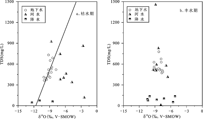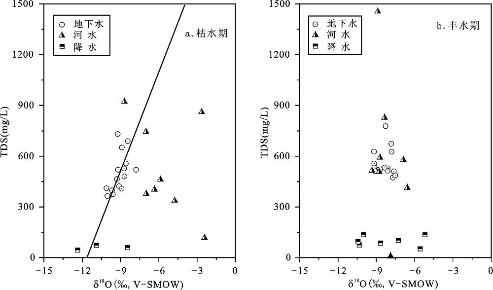利用研究区内地表水与地下水TDS与δ18O的值进一步分析了降水、河水及地下水在干枯季节的相互关系(图7),结果显示: