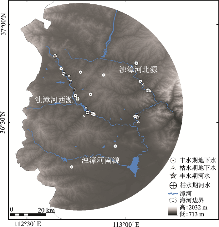 漳河是海河流域南源之一,其上游为浊漳河与清漳河,其中浊漳河源流分为北源、西源、南源(图1),北源发源于山西省榆社柳树沟、西源发源于长治地区沁县的漳源庙、南源发源于山西长子县发鸠山,3条源流与石梁附近汇合后为浊漳河干流,浊漳河与清漳河不同,其流经上党盆地,流域周边为高山,内部多丘陵和平原,地势平缓,黄土覆盖深,植被覆盖较差,水土流失高发,河流泥沙含量较多。浊漳河流域属于温带季风气候,四季分明,夏短冬长,无霜期短,年降水量为560 mm[6]。浊漳河流经地区为山西省长治地区重要的农业耕地主要的分布区,水资源供需矛盾尖锐,地下水超采较重,地表水与地下水转换关系复杂。