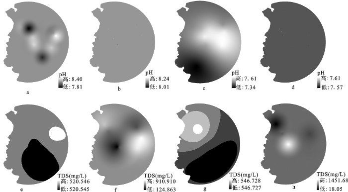 图2 研究区不同时期地下水、河水pH和TDS时空分布 a~d分别为枯水期地下水、河水、丰水期地下水、河水pH;e~h分别为枯水期地下水、河水、丰水期地下水、河水TDS。