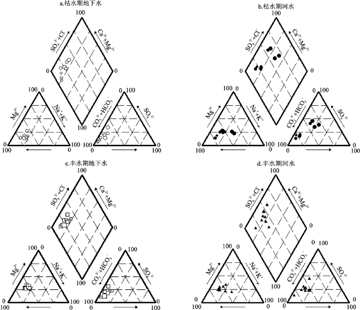 图3 海河源区不同时期地下水、地表河水主要离子Piper三线图